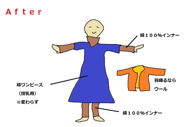 部屋着です。冬のはじめに出産してから、夏にも使えるような薄手のワンピースの上に厚手のカーディガンを着ていました(授乳服をたくさん買いたくないので)。ジェラートピケのパチモンみたいなやつ(*´▽`*)しかし腕まくりをするとモコモコして邪魔に感じたため、フェリシモの薄手のインナー(ハイネックのカットソーとレギンス)をプラスしてカーディガンは着ないことに。形で選んだのですが、これが綿(コットン)100%のものだったのです。