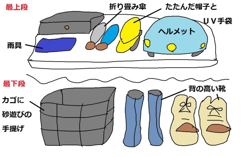 靴より下に、頭にかぶるもの(ヘルメット)を置くのは抵抗があるな…ということで、ヘルメットは迷わず一番上に。砂だらけのものを靴より上に置くと砂が入りそう…ということで砂遊びグッズは最下段へ。これで上と下の棚板の高さが決まりました。